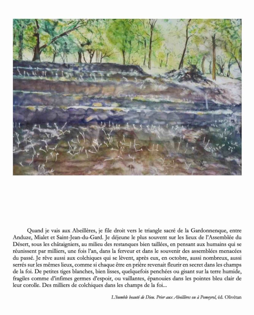 Rendez-vous, donc, le 6 septembre, pour voir des représentations de lieux de recueillement du protestantisme et notamment, avec un regard en abîme, des aquarelles figurant l’Assemblée du Désert et aussi « l’Assemblée des Colchiques », glissement du printemps à l’automne en Cévennes.